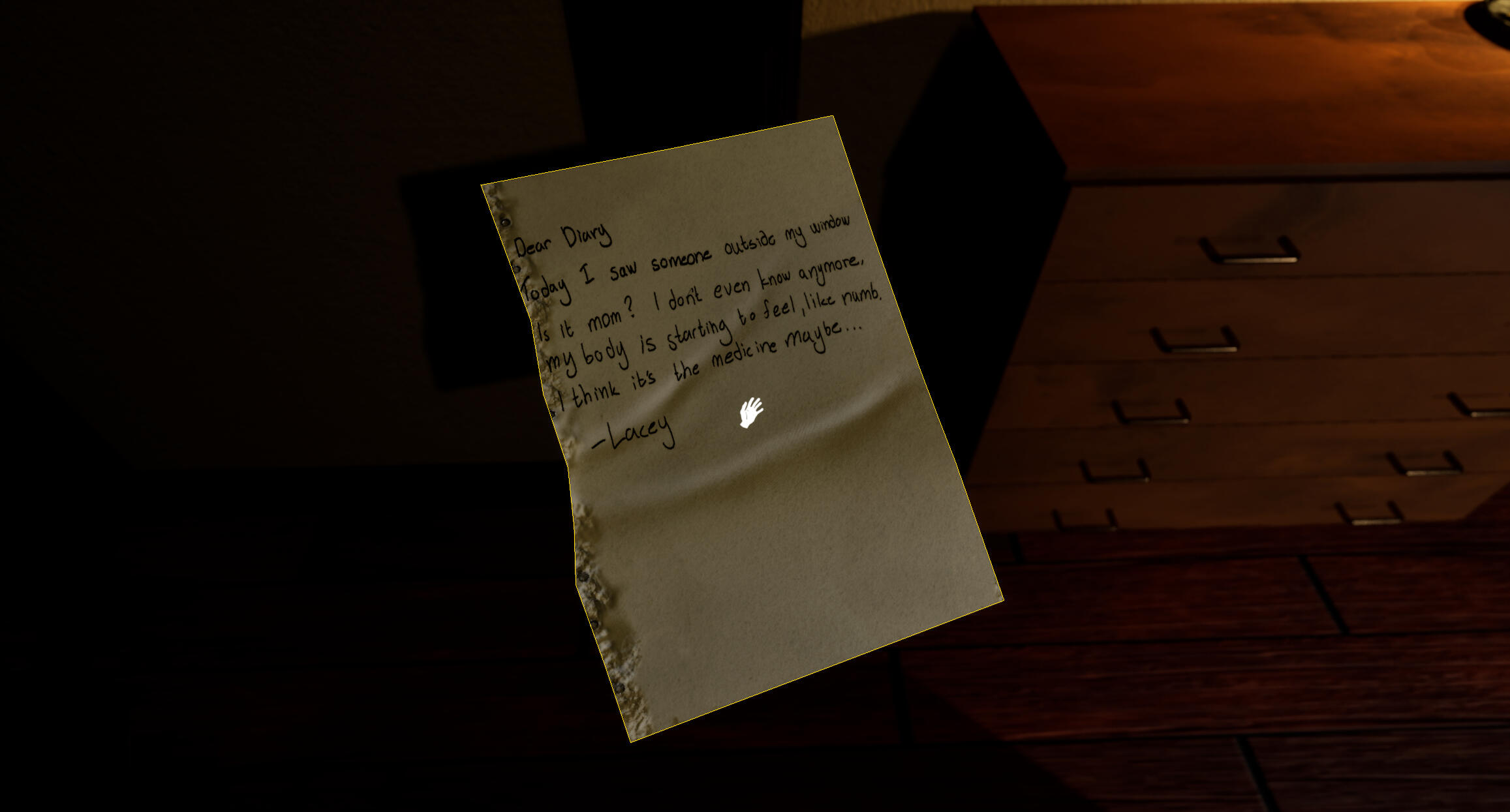 During preproduction, I designed gameplay mechanics suited to the genre that our team collectively agreed upon. Additionally, we decided to draw inspiration from real-life events for the original story, which I developed based on the tragedy of Lacey Fletcher.