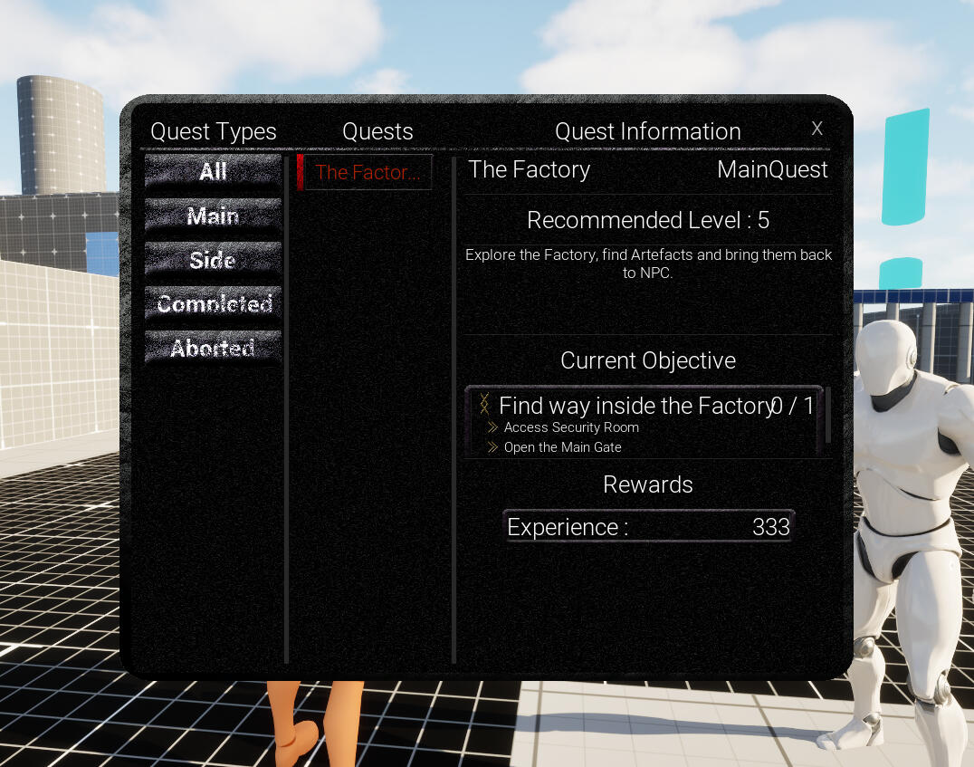 Combining Easy Quests system with player character allowed to structure main quest with three objectives, each transitioning smoothly into the next upon completion. Objectives are structured to guide the player through exploration, encounters and puzzle solving.This setup was a foundation for gameplay features and level design that combined provides cohesive experience.